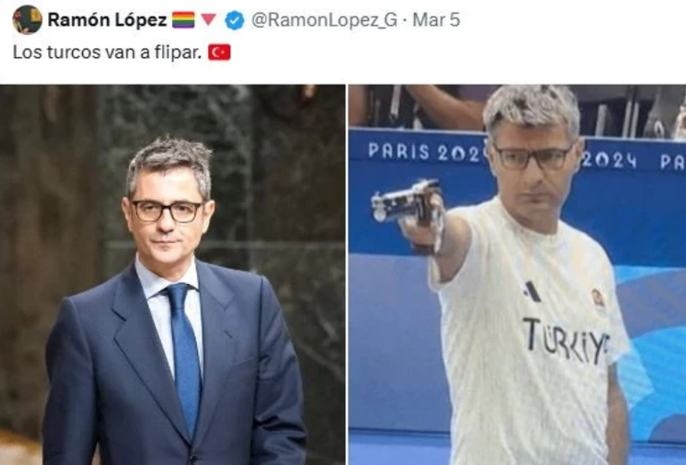 İspanya’da bir sosyal medya kullanıcısının Adalet Bakanı Félix Bolaños’u milli sporcu Yusuf Dikeç’e benzetmesi gündem yarattı. Paylaşımı alıntılayan Bolaños, “Aynı kişi olmadığımızın garantisini veriyorum” diyerek Türklere selam gönderdi.